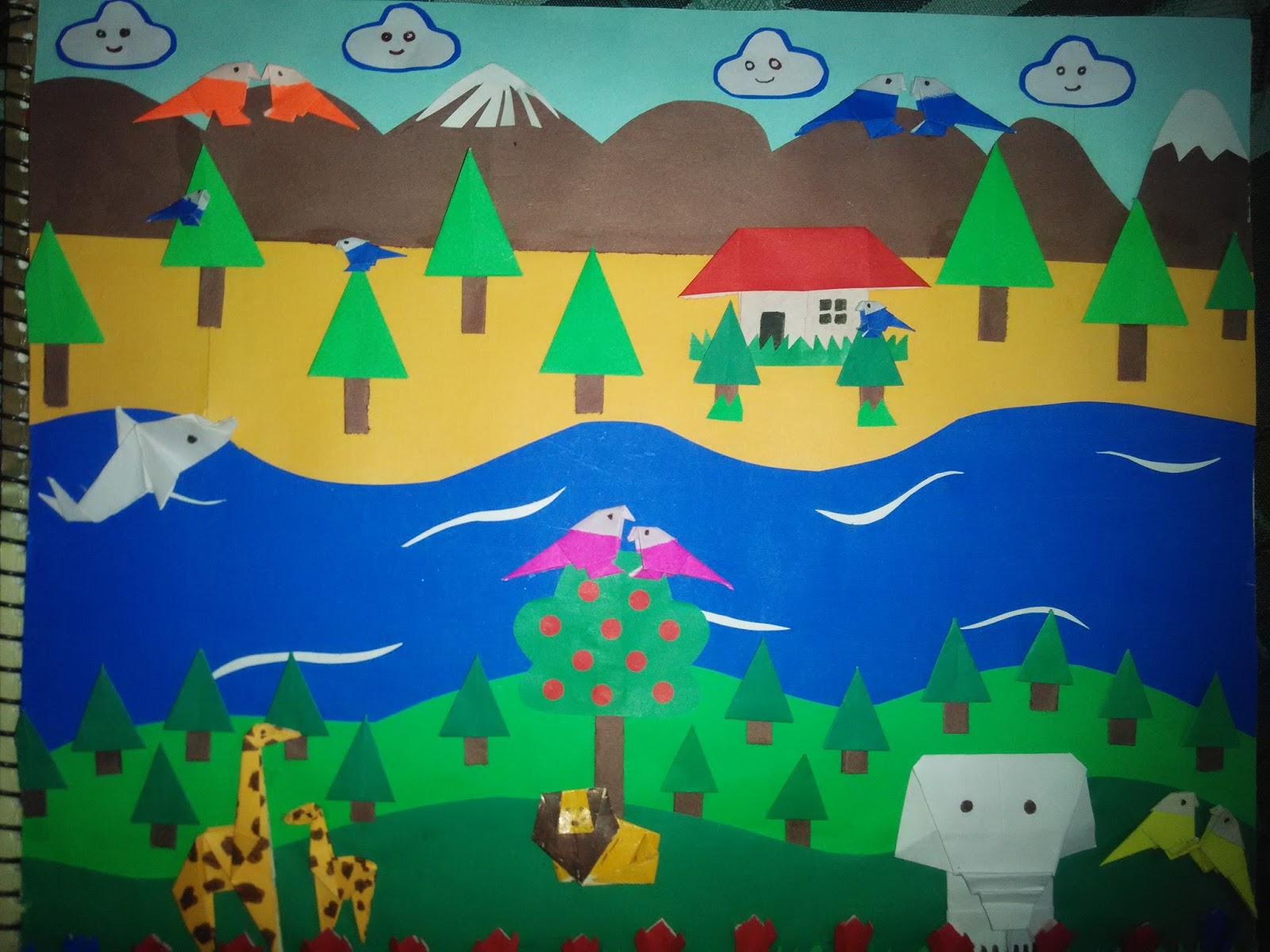 We can make a beautiful Scenes with small small paper folding scriptures. I have created a drawing file cover using Different Color Sparrows, Trees, Lion, Giraffe Elephant, Tulip Flowers, River, Dolphin, Hut, Clouds, Hills, Grass. Using these types of scriptures we can also create Sceneries to decorate our house.